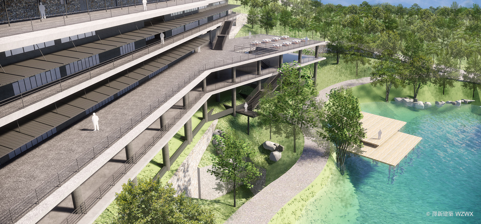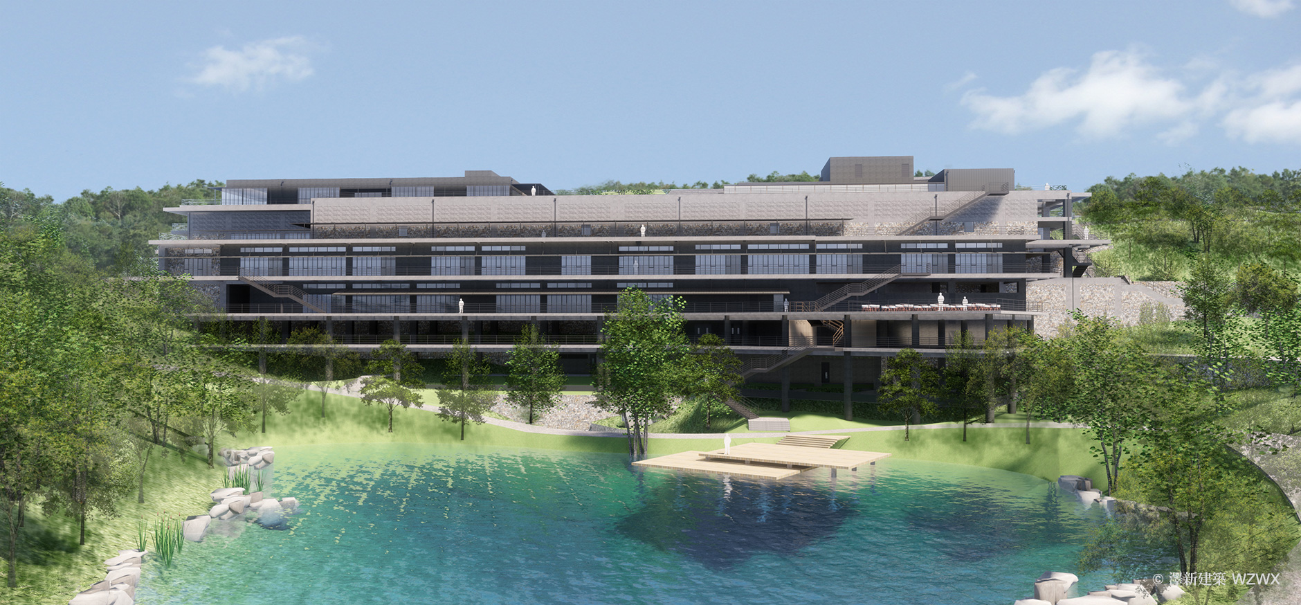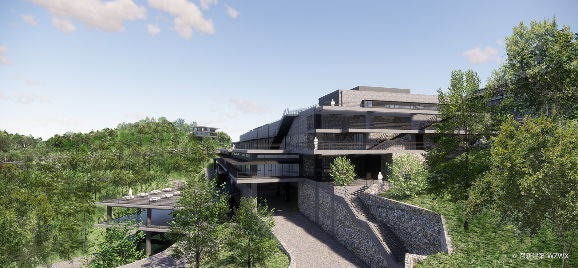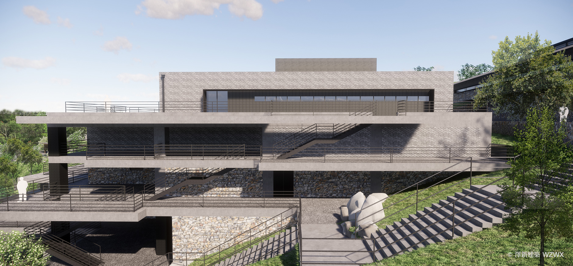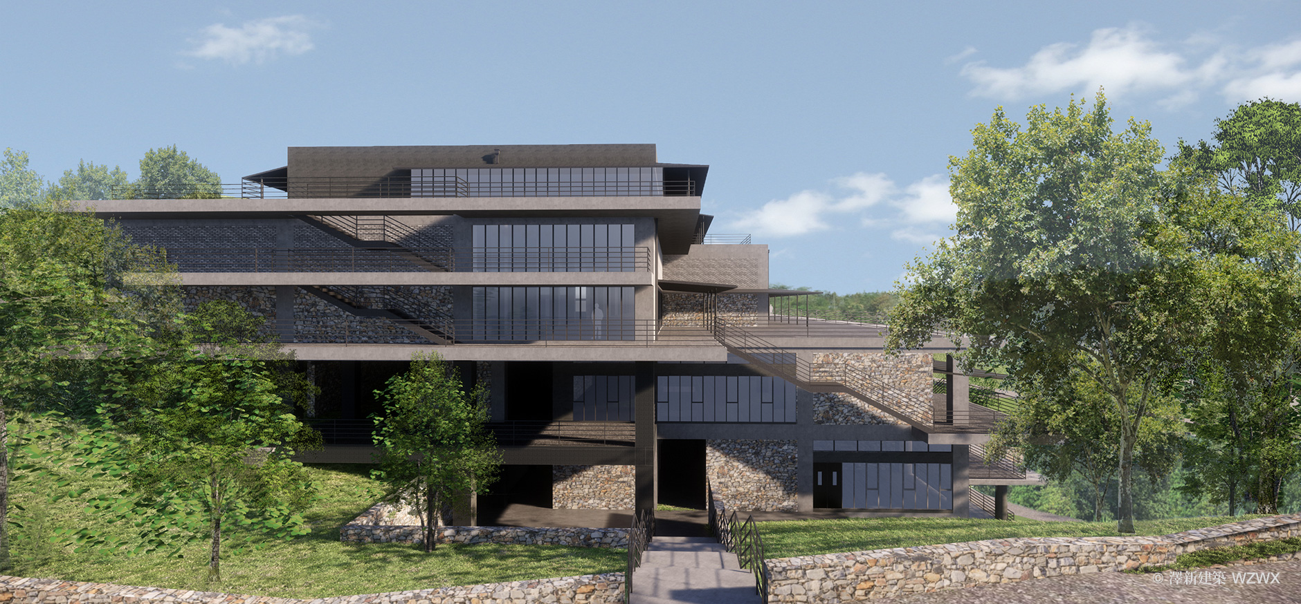 外观的建筑型态彷佛一层层的大型平台层层迭加,楼层以阶梯式的结构依山而建。内部空间嵌入山体,有利于内部作业空间环境的自然恒温。西侧长向立面则相对的注重自然采光.,外围另设置宽阔的室外阳台或大型露台空间的运用基本反映着温暖气候地带的当地的生活文化。