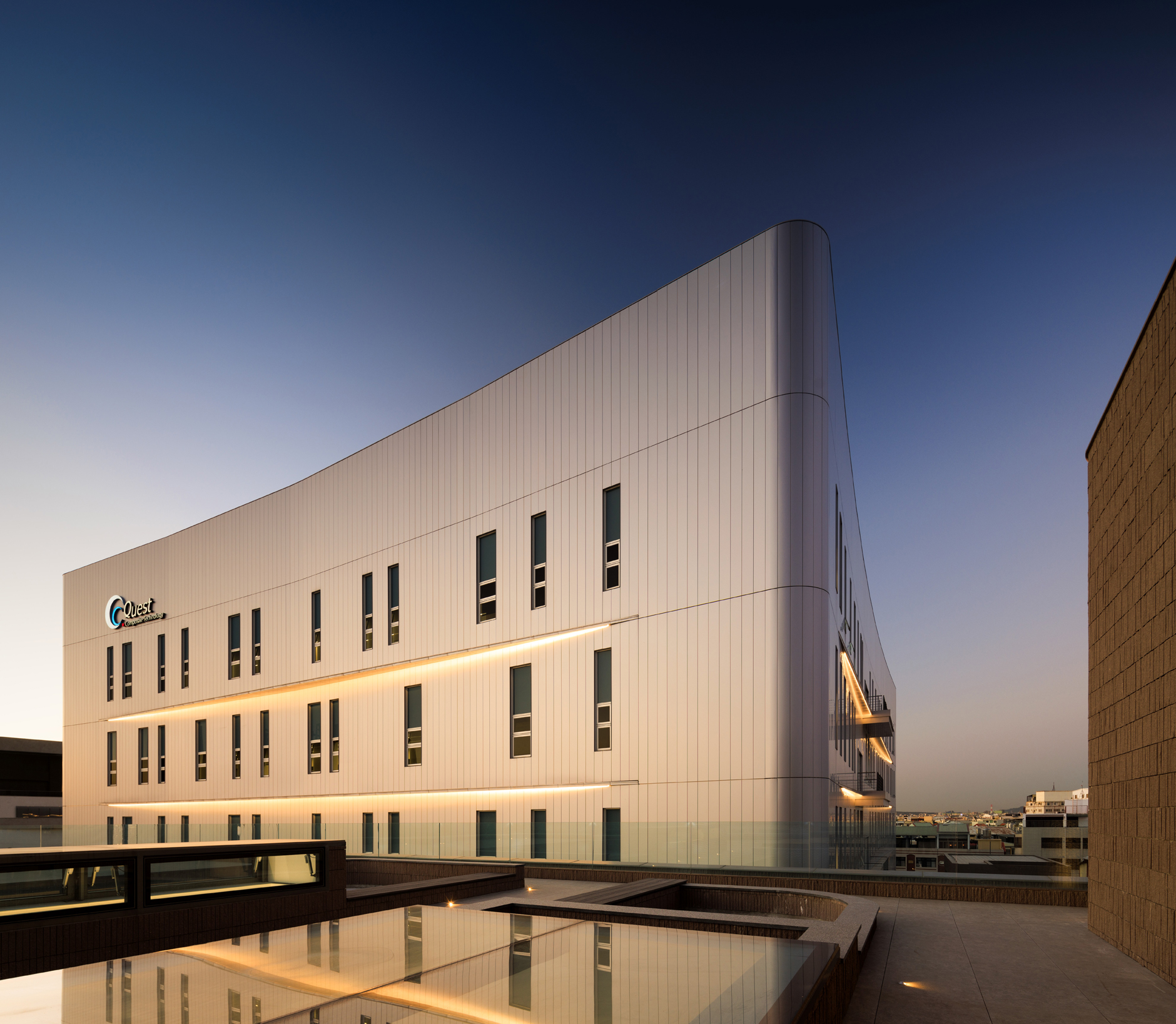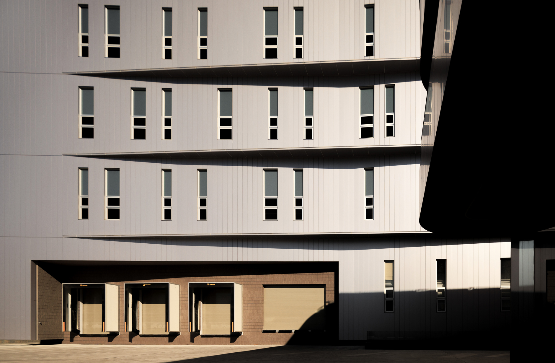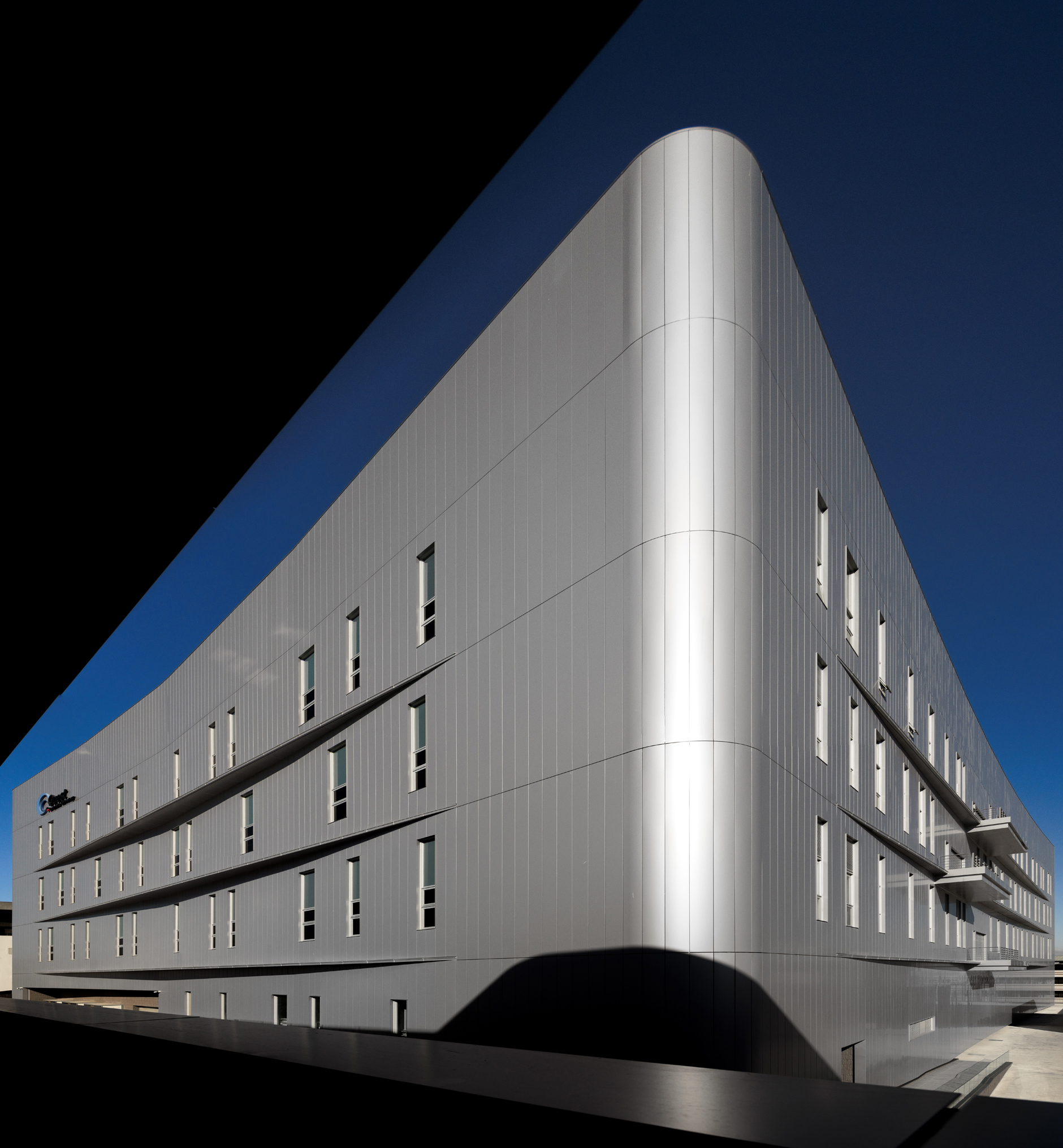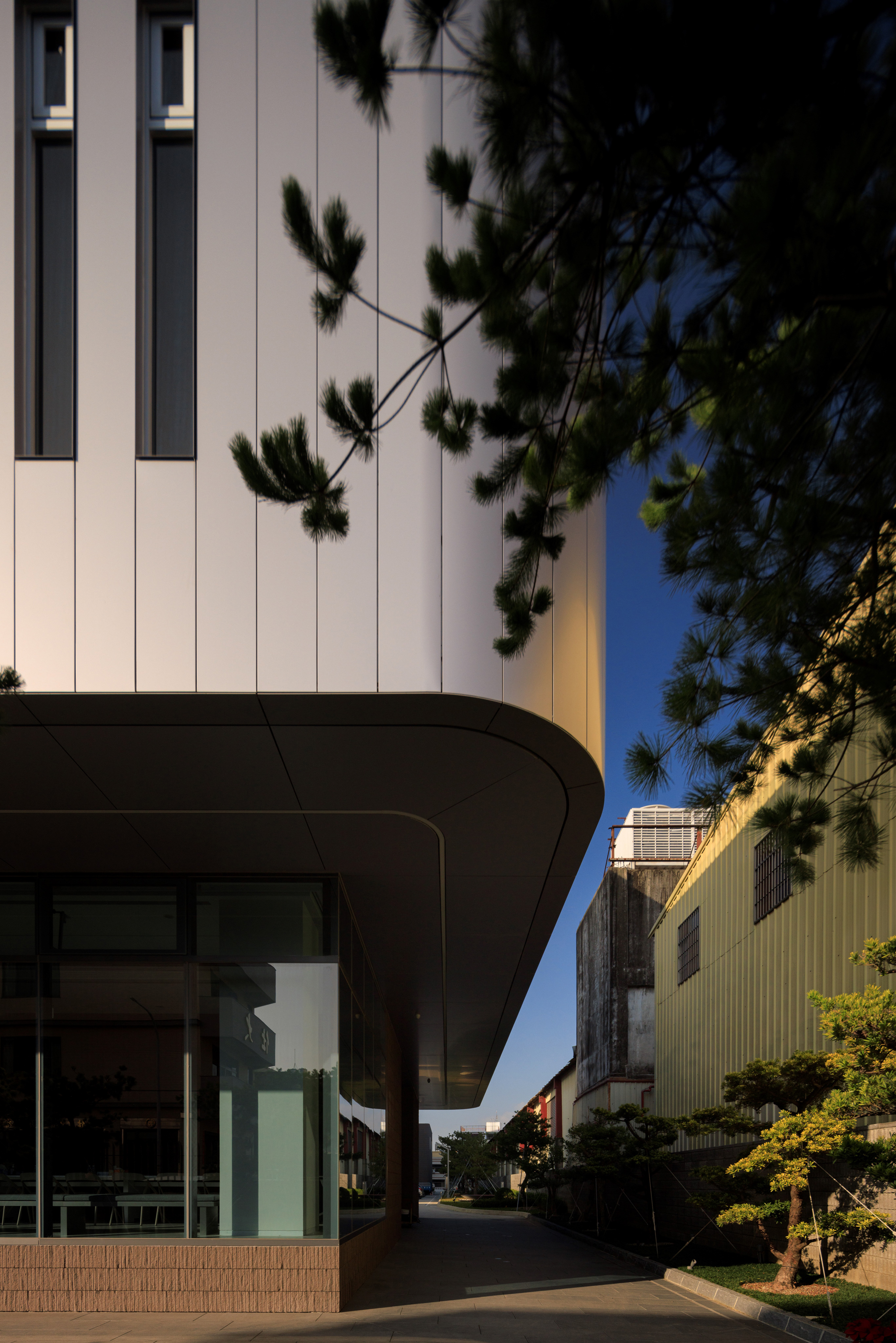 多层的厂房主体构成一个稳重坚定的体量,平面尺寸为 54 m x 80 m,高度近 30m - 生产楼层室内高度达 7 米。 建筑外壳由由保温复层铝板构成连续性的立面,并结合精准的细节设计,传达一种纯净,极致的质感。建筑体积被轻轻地抬离地面,增添了轻盈感。 四周的圆角和柔和的内凹曲线勾勒出了生产基地内在的动能感与独特的企业形象。 起伏光滑的建筑面向与自然光影的相互作用,体现了丰富的面向。